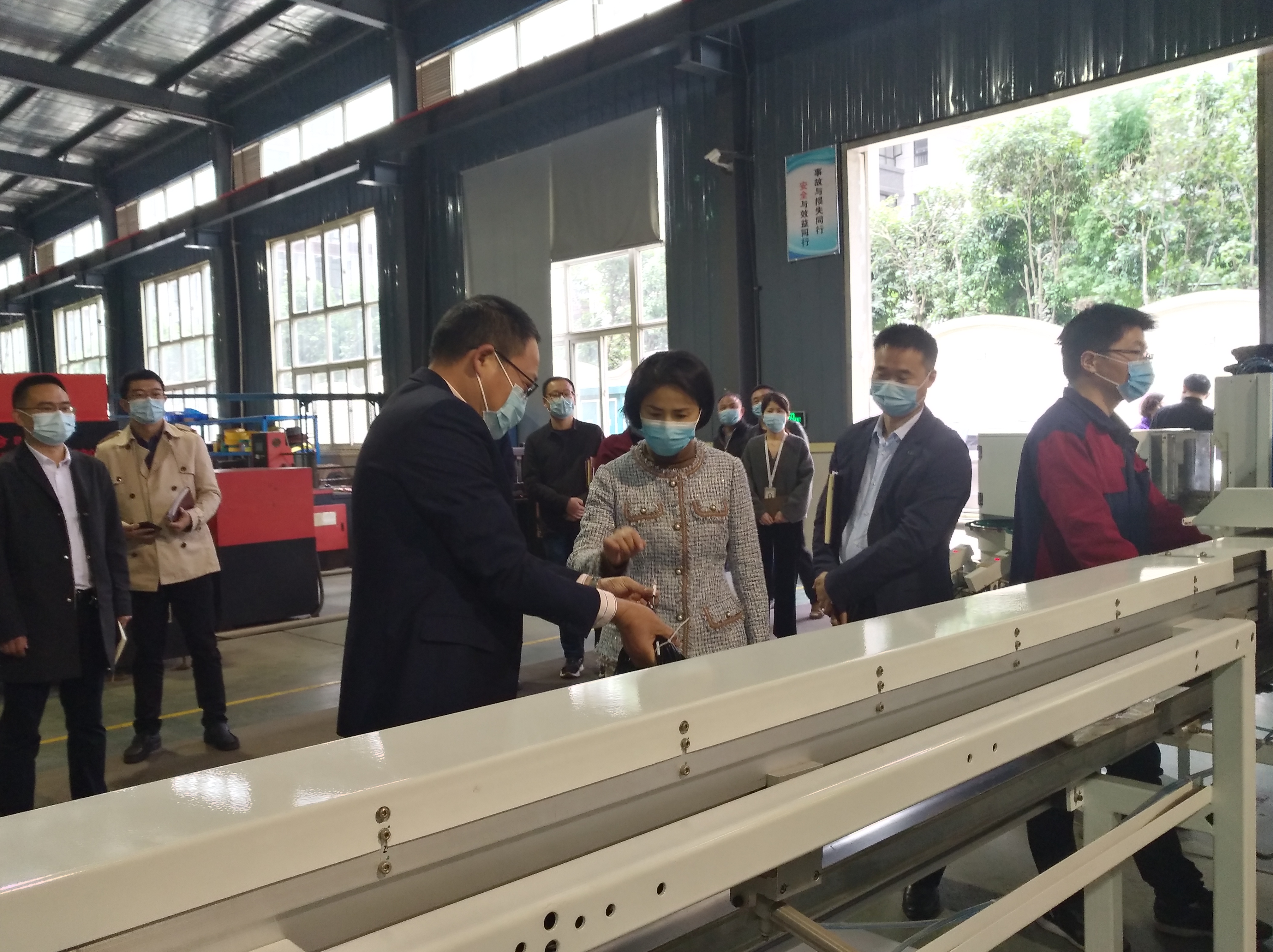 在集團(tuán)公司領(lǐng)導(dǎo)的陪同下,徐書記一行參觀了生產(chǎn)車間全自動(dòng)端子壓著機(jī)、智能機(jī)器人、電動(dòng)自行車電池智能充電柜,邊考察邊提出指導(dǎo)意見。